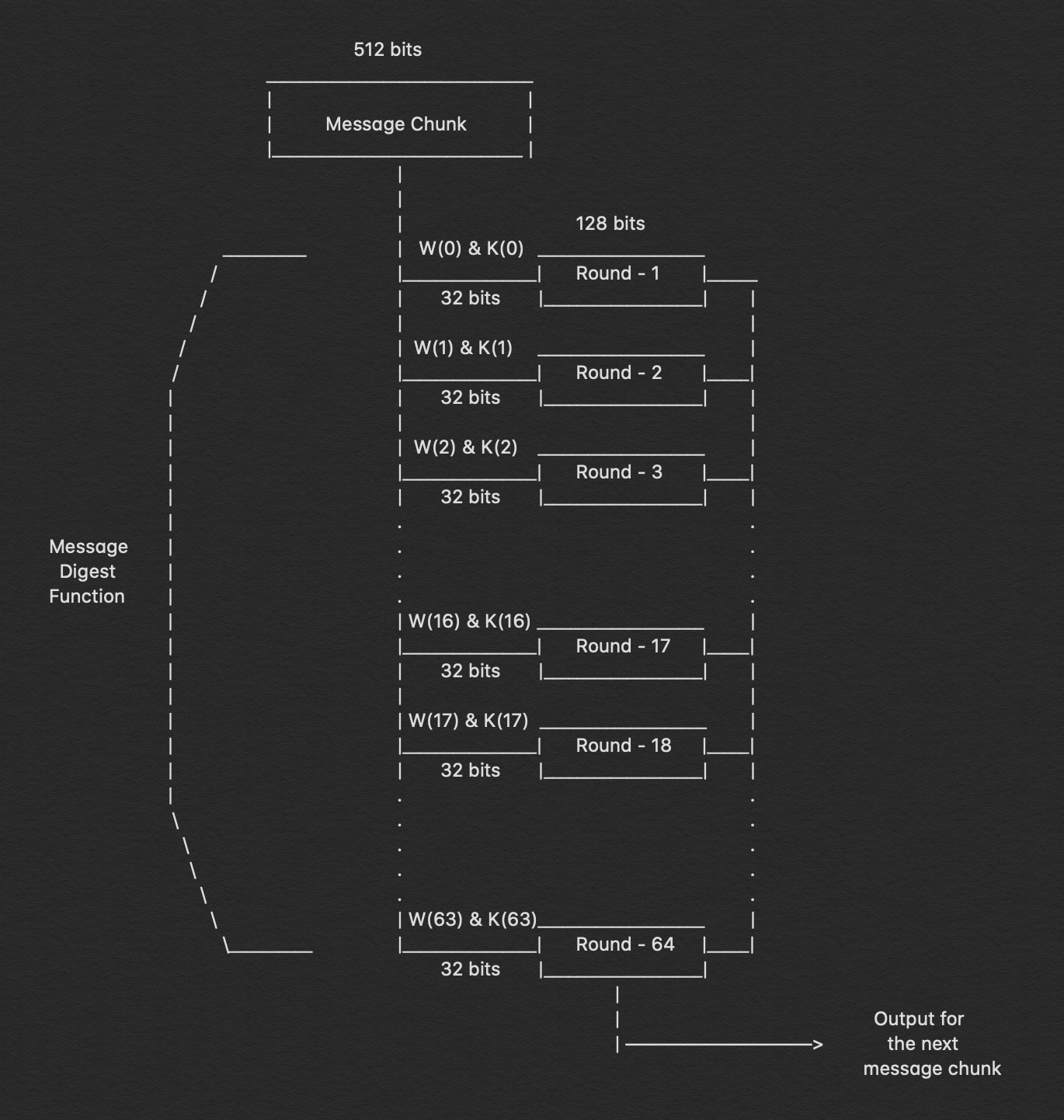 The 64 rounds of operation conducted on a 512-bit message are plainly visible in the figure above. We can see that we send in two inputs: W(i) and K(i). During the first 16 rounds, we further break down the 512-bit message into 16 pieces, each consisting of 32 bits. Indeed, we must compute the value for W(i) at each step.